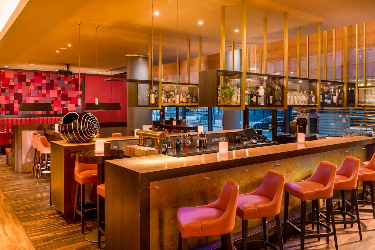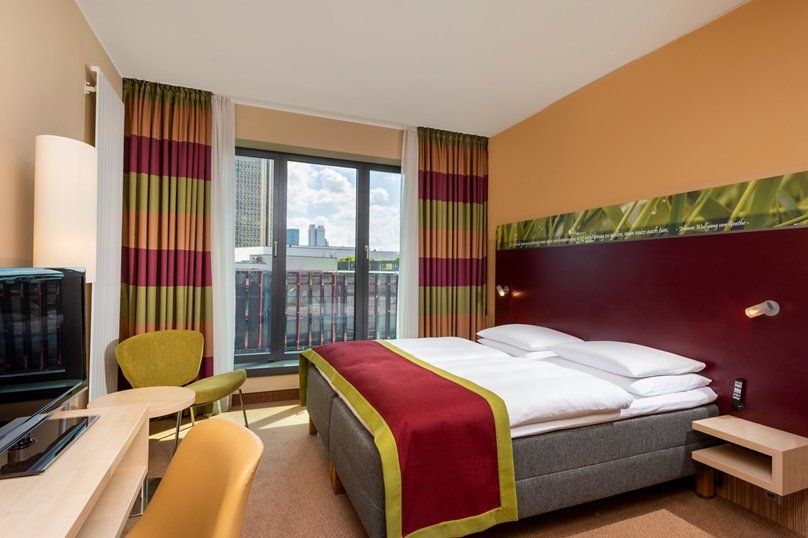 Additional amenities include a 130 m² fitness center located on the top floor, providing panoramic views of Frankfurt's skyline. Guests can also enjoy the hotel's bar with an outdoor area, perfect for unwinding after a busy day. The establishment is committed to sustainability, holding an eco-certification and implementing various green practices throughout its operations.